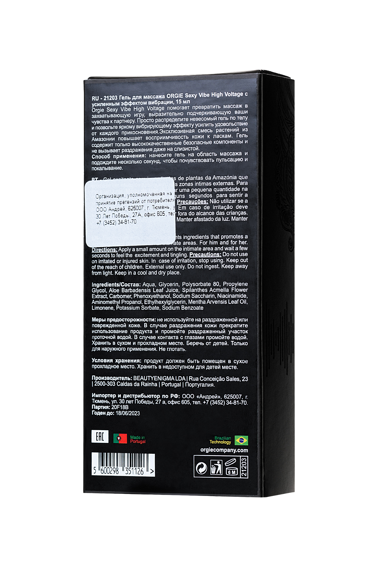 Орджи Sexy Vibe High Voltage помогает превратить массаж в захватывающую игру, выразительно подчеркивающую ваши чувства к партнеру. Просто распределите невесомый гель по телу и позвольте яркому вибрирующему эффекту усилить удовольствие от каждого прикосновения. Эксклюзивная смесь растений из Амазонии повышает восприимчивость кожи к ласкам. Гель содержит только высококачественные безопасные компоненты и не вызывает раздражения даже на слизистой. Способ применения: нанесите гель на область массажа и подождите несколько секунд, чтобы почувствовать пульсацию и покалывание.