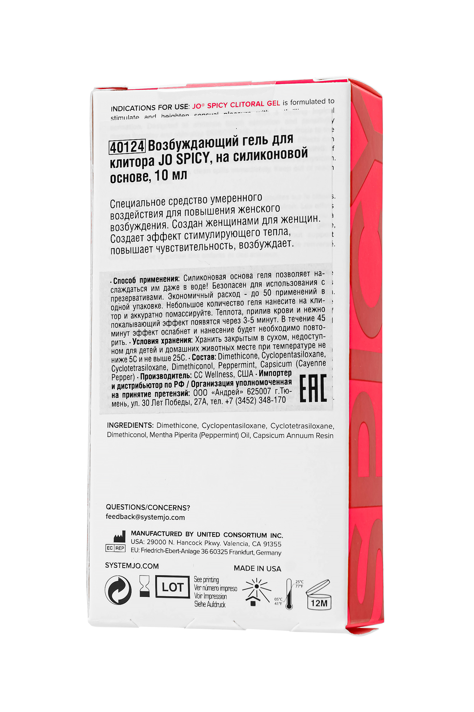 Систем Джо Спайси — это возбуждающий гель для клитора на силиконовой основе, созданный женщинами для женщин, чтобы подарить нежное и увлекательное наслаждение. Этот роскошный стимулятор раскрывает новые грани чувственного наслаждения благодаря мягкому согревающему эффекту, который усиливает чувствительность и дарит яркие ощущения. Уже через 3–5 минут после нанесения вы ощутите приятное тепло, нежное покалывание и прилив крови, делая каждое прикосновение более интенсивным и незабываемым. Созданный из качественных ингредиентов, включая перечную мяту и экстракт кайенского перца, обеспечивает естественное, приятное согревающее воздействие. Его специальная формула с умеренным эффектом создана для комфортного использования, идеально подходя как для интимных моментов, так и для экспериментов. JO SPICY рассчитан на экономичный расход: один компактный флакон объемом 10 мл хватает до 50 применений. Чтобы ощутить всю магию геля, нанесите небольшое количество на клитор и слегка помассируйте. Эффект длится до 45 минут, а затем его можно легко обновить. Уникальная силиконовая основа делает гель идеальным даже для использования в воде — например, в душе или ванной. Этот возбуждающий гель станет вашим личным секретом для романтических ночей, усиливая возбуждение и даря чувственные удовольствия, которые запомнятся надолго Этот продукт безопасен для применения с презервативами и не оставляет липкости, лишь мягко увлажняя кожу. Это роскошное средство для тех, кто ищет что-то особенное для своего интимного опыта, раскрывая чувственные грани с каждым применением. Как использовать: Просто нанесите каплю геля на клитор, аккуратно помассируйте и позвольте теплу разжечь вашу страсть. Его эффект длится до 45 минут, а если вы захотите большего — нанесение легко повторить. Он безопасен для использования с презервативами, не липнет и не оставляет следов. После завершения интимной близости средство легко смывается водой. Качество, которому можно доверять: Стимулятор произведен в США и сертифицирован по стандартам FDA и ISO. JO сочетает высокие стандарты качества, безопасность и удобство, становясь незаменимым элементом для незабываемых интимных экспериментов.