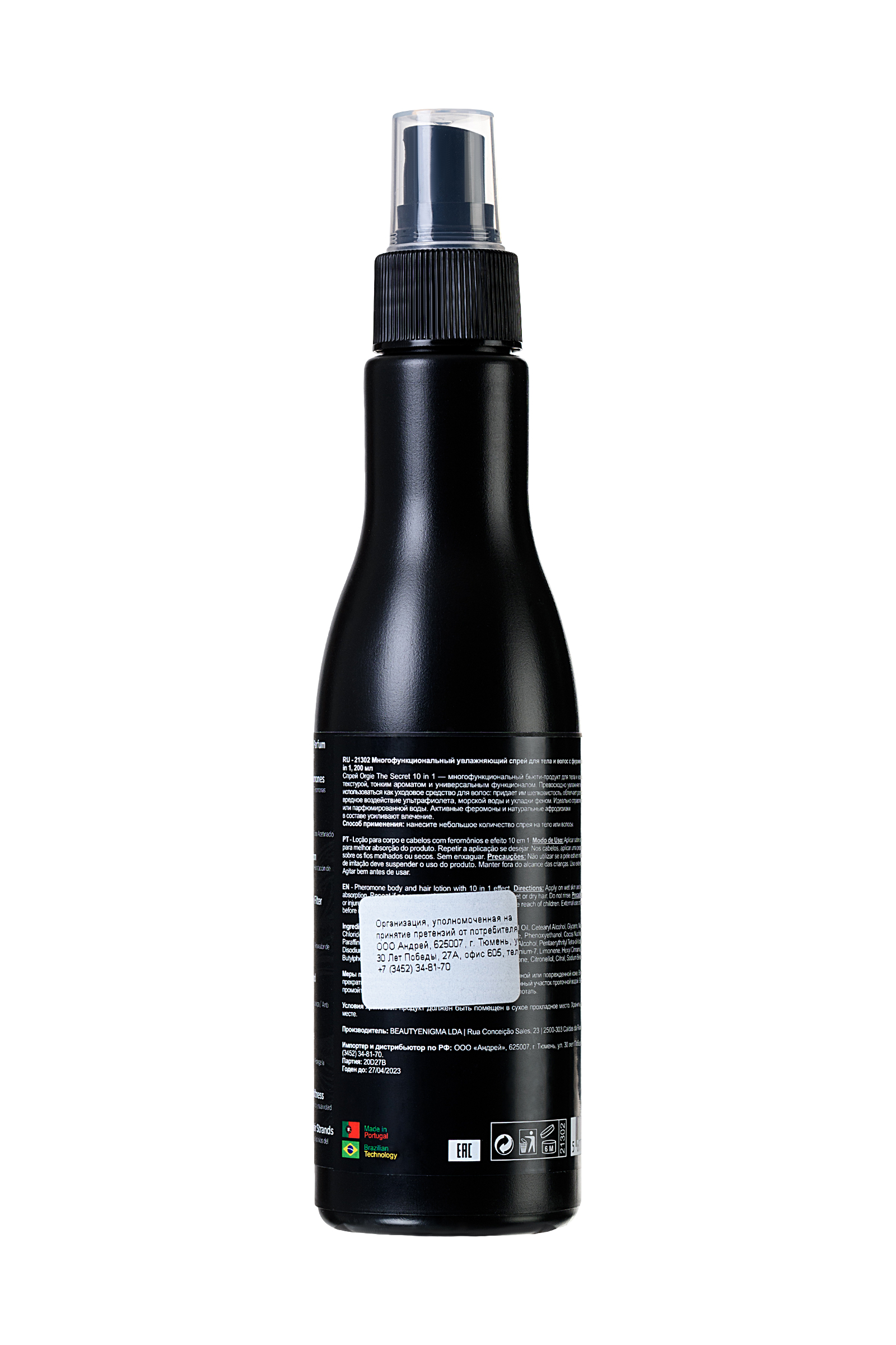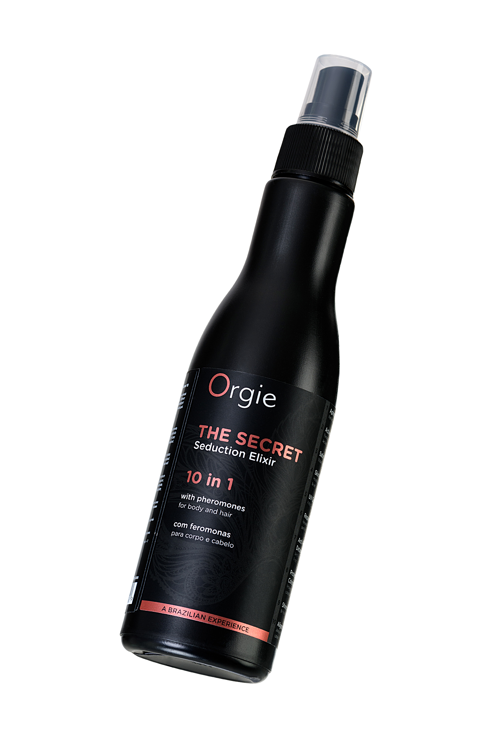 The Secret Elixir 10 в 1 от бренда Орджи — это парфюмированный бальзам для волос и тела с активными феромонами и афродизиаками. Легкая консистенция, очень стойкий возбуждающий аромат и эффект соблазнения. У этого продукта есть 10 причин, почему вы должны иметь его всегда в своей косметичке: • сладковато-ванильный возбуждающий аромат• содержит активные феромоны• придает шелковистость волосам и коже• увлажняет кожу• защищает волосы от ультрафиолета• восстанавливает посеченные кончики• волосы легко расчесываются и не электризуются• придает блеск и мягкость• закрывает чешуйки волос• выполняет роль термозащиты Способ применения: Нанесите парфюмированный спрей на волосы и кожу, чтобы ощутить аромат, увлажненность и ухоженность кожи и волос и притягательность в глазах мужчин. Аромат держится до 12 часов на волосах, раскрываясь постепенно при прикосновении.