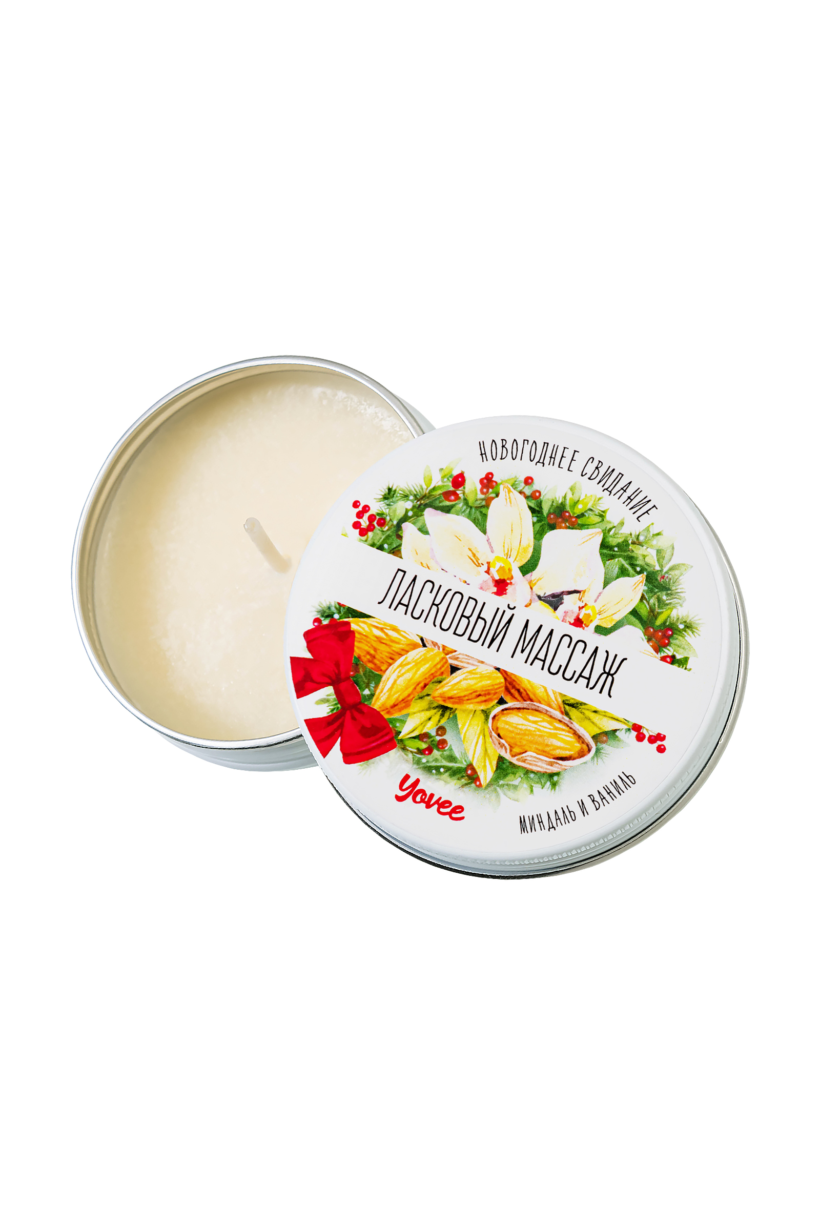 Массажная свеча Ёви «Ласковый массаж» с ароматом «Миндаль и ваниль» - изысканный аксессуар для новогоднего свидания. Изготовлена из 100% натуральных масел, которые питают, увлажняют, смягчают кожу и делают её шелковистой. Ненавязчивый сладкий аромат миндаля и ванили остается легким шлейфом, напоминая о проведенных минутах блаженства. Благодаря праздничному дизайну упаковки свеча отлично подходит в качестве презента. Основа свечи - гидрогенизированное соевое масло, которое идеально смешивается с уходовыми маслами и отдушкой, а при комнатной температуре приобретает плотность воска. При горении свечи твердый воск расплавляется в тёплое массажное масло, не обжигающее кожу. Уходовые масла: пальмовое, кокосовое и масло виноградной косточки - многофункциональны. Пальмовое масло помогает справиться с авитаминозом кожи, дарит приятное увлажнение и свежесть, смягчает огрубевшую и шелушащуюся кожу, помогает справиться с возрастными изменениями. Кокосовое масло придает коже бархатистость, защищает, смягчает, разглаживает. Масло виноградной косточки повышает тургор, эластичность и упругость кожи, стимулирует выработку коллагена и эластина, ускоряет процесс регенерации кожного покрова. Сладкая парфюмированая отдушка добавит приятных ощущений при использовании. Предназначена для наружного применения. Не содержит парафина. Не подходит для ароматизации помещения, использования в качестве лубриканта. Применение: зажгите свечу до массажа, когда образуется достаточное количество масла, потушите её. Проверьте температуру масла на внутренней стороне ладони, при необходимости дайте маслу слегка остыть. Нанесите на тело и массирующими движениями распределите по телу. Наслаждайтесь тонким ароматом и бархатной кожей!